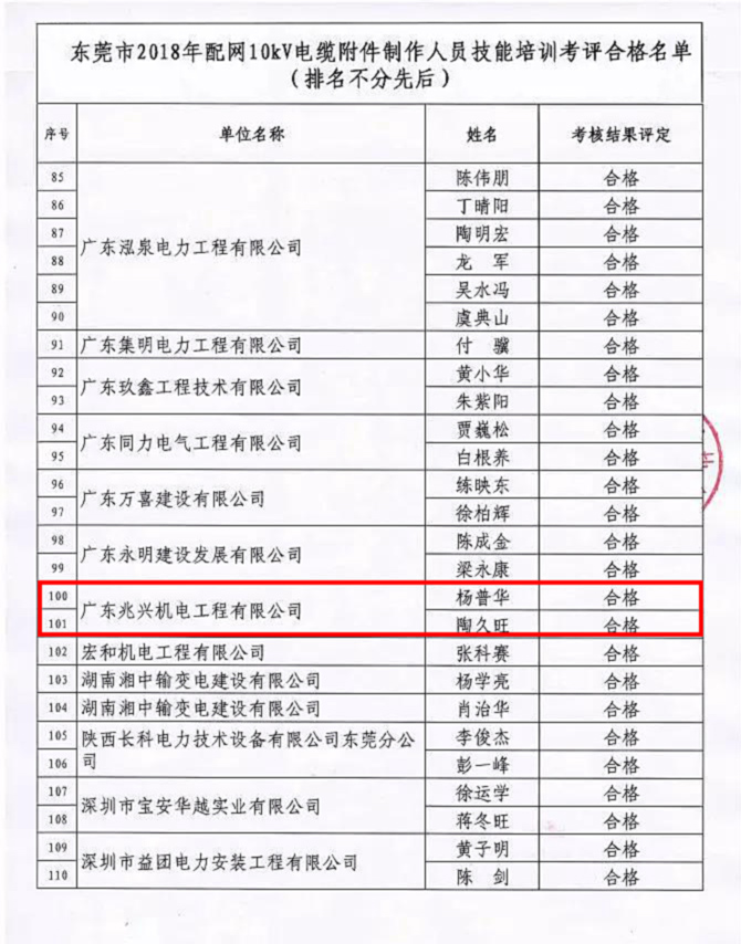 為了提高我司電力作業(yè)人員的技術(shù)、技能水平,我司指派陶工、楊工參加?xùn)|莞市電力行業(yè)協(xié)會(huì)組織的東莞市2018年配網(wǎng)10kV電纜附件制作人員技能培訓(xùn)。