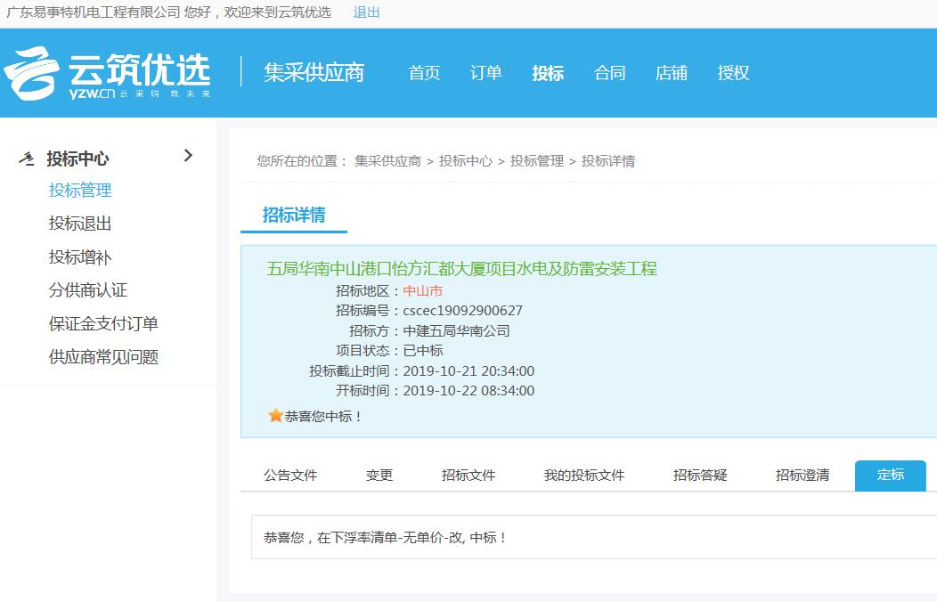 2019年11月18日,廣東易事特機(jī)電工程有限公司參與中建五局華南公司組織的《五局華南中山港口怡方匯都大廈項(xiàng)目水電及防雷安裝工程》招標(biāo)中,最終以良好的信譽(yù)、行業(yè)經(jīng)驗(yàn)、強(qiáng)大技術(shù)實(shí)力以及優(yōu)秀的方案、合理的報(bào)價(jià)贏得了招標(biāo)單位的肯定,順利中標(biāo)。